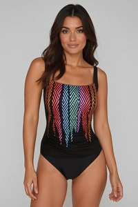 Vivisence Damen Badeanzug Einteilig Bauch Kaschieren Gepolsterte Cups Breite Verstellbare Träger Gefüttert Vorne Buntes Muster Ideal für Strand und Schwimmbad, schwarz-mehrfarbig