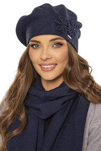 Vivisence Damen Baskenmütze Schal Set Wolle Blumenapplikation Warm Elegant 7007, dunkelblau