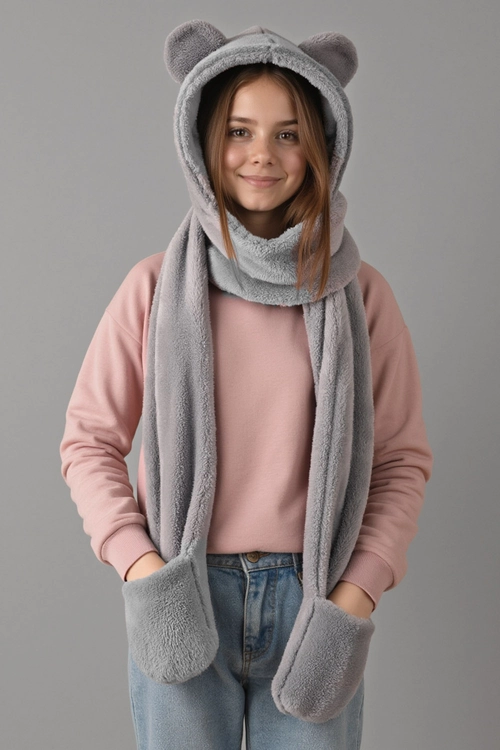 Meet the charming bear ear hood that blends style and function for chilly days. This three in one design works as a hood, scarf and mittens in one cozy piece, wrapping you in comfort from head to hands. The long hood ends form handy mitten pockets to warm your fingers, while the playful ears add a cute, fashion forward accent to everyday looks.