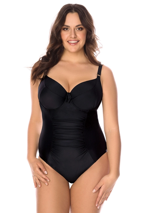 Classic ladies swimsuit with padded cups, v shape neckline and subtle bow added for extra charm. Back clasp closure, Adjustable, not separable shoulder straps. made of top quality fabric, discoloration resistant. Composition: 80% polyamide, 20% elastane.