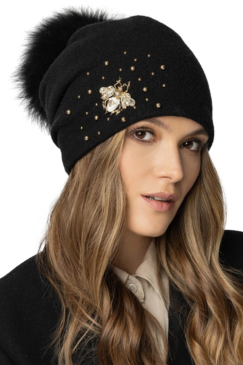 Vivisence Women's Pom Pom Hat Wool Handcrafted Virgin Wool 7079, black