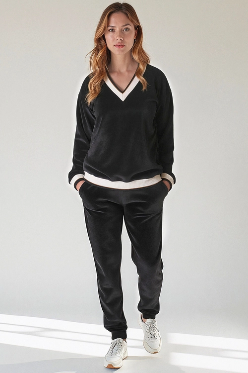 Vivisence Women Tracksuit Velour Set Ribbed Cuffs Comfortable Loungewear 9201, Black