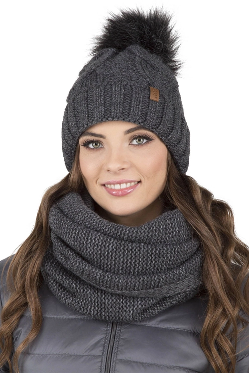 Vivisence Bonnet Femme Et Écharpe Pour L'automne et L'hiver À Pompon Cache-cou Ensemble Classique En Fils Chauds Avec Doublure En Polaire Parfait Pour Les Journées Froides 7014, gris foncé