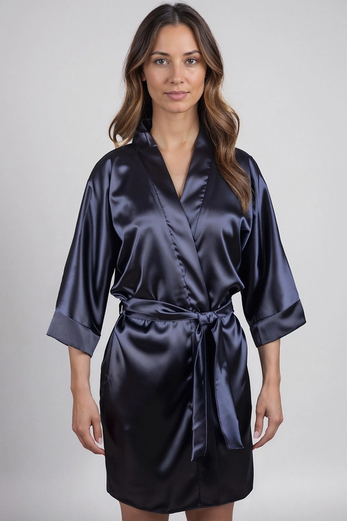 Vivisence Femme Peignoir Satin Court Manches Trois Quarts Ceinture Bien Être, navy blue