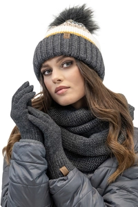 Vivisence Bonnet Cache-Cou Pliable Et Gants Pour Femme L'Automne et L'Hiver Ensemble À La Mode Ajusté Avec Doublure Polaire Antistatique Confortables En Fil Chaud Doux Avec Pompon Écologique 7099 Kmpl, gris foncé